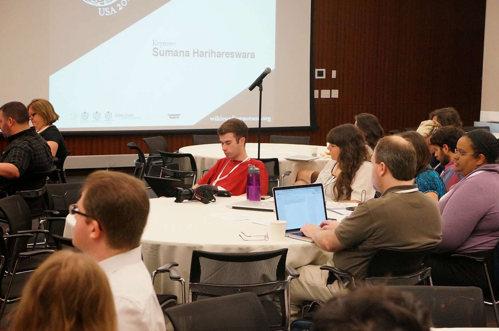 Amid the smell of coffee and bagels, the crowd quieted down to listen to the opening by Jennifer Baek, who, in addition to getting us energized, also paused to recognize Ardrianne Wadewitz and Cythia Sheley-Nelson, two Wikipedians who had, after contributing greatly to the Wikimedia movement, had recently passed. The mood became more uplifting as Sumana Harihareswara began her keynote, discussing the wonders of contributing knowledge and her experience with the Ada Initiative, Geek Feminism, and Hacker School. She detailed how the Wikimedia culture can learn from the experiences at Hacker School, discussing different methods of learning, and how these methods allow all of us to nurture learning in a group. She went on to discuss the difference between liberty and hospitality, and the importance of both to community, detailing how the group must ensure that individuals do not feel marginalized due to their gender or ethnicity, but also detailing how good hospitality engenders contribution as well as learning. Thus began WikiConference USA 2014 at 9:30 am, on May 30, 2014.