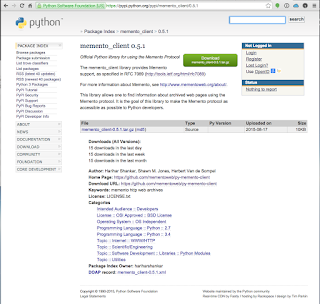 Getting there required Pypi, a site that globally hosts Python projects (mostly libraries). Pypi not only provides storage for built code so that others can download it, it also requires that metadata be provided so that others can see what functionality the project provides. Below is an image of the Pypi splash page for the py-memento-client.