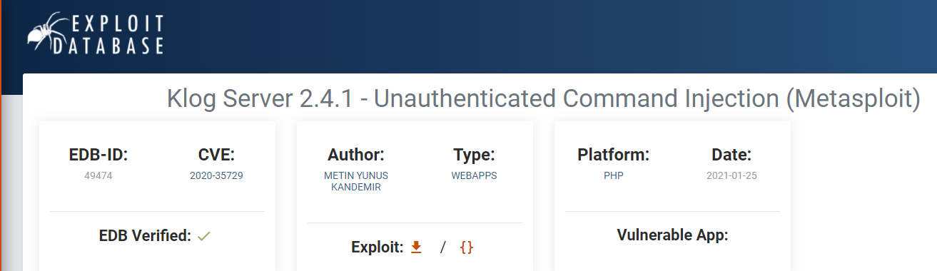 | Figure 3: Excerpt from the Exploit Database showing a verified submission which maps to CVE-2020-35729. (Source: https://www.exploit-db.com/exploits/49474) |