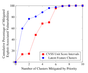 - A few additional details will help clarify the interpretation of these results and my choice of wording. Ross et al. were motivated to "create a system that provides better intelligence for vulnerability mitigation for system administrators than that implied by CVSS scores." Their clustering strategy, where k is the number of clusters, provides a mechanism to prioritize patching by examining the likelihood of a exploit existing for CVE IDs with similar CVSS vectors. Figure 4 was not included in my original paper summary but does appear (Figure 10 in the original paper) as Ross et al. discuss their temporal approach to validate the accuracy of their clustering algorithm over time. In this Figure, the authors show "the cumulative reduction of exploit-associated vulnerabilities in the 2013 calendar year assuming that they are mitigated in priority order using 1) our ten-cluster ordering and 2) CVSS scores 'clustered' by unit-score intervals." The blue line shows that the Ross et al. algorithm which assigns a higher priority to CVE IDs with comparable entries in Exploit-DB will result in more of those same CVE IDs being patched by a system administrator who implements their ranking order. The authors did provide an additional observation for these results noting that "vulnerabilities with CVSS scores v ∊ [7, 8] were the most exploited in 2013, not those with v ∊ [9,10]."