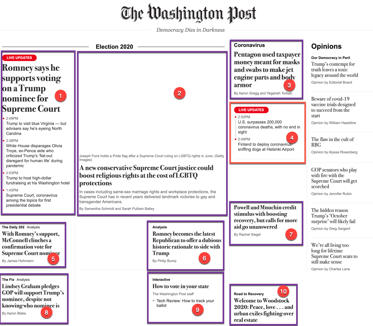 Box #1 is the one story on the page that is about the milestone. The object in the top center is about COVID-19, but functions as an information dashboard with options for seeing data for world cases, U.S. cases, etc.