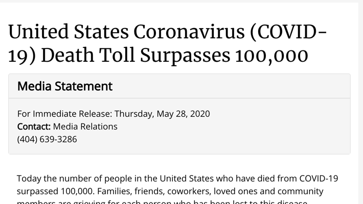So I was not going to be able to use the CDC Data Tracker to derive the first milestone. However, the CDC posted a press release on May 28, 2020 indicating that the U.S. had reached 100,000 deaths.